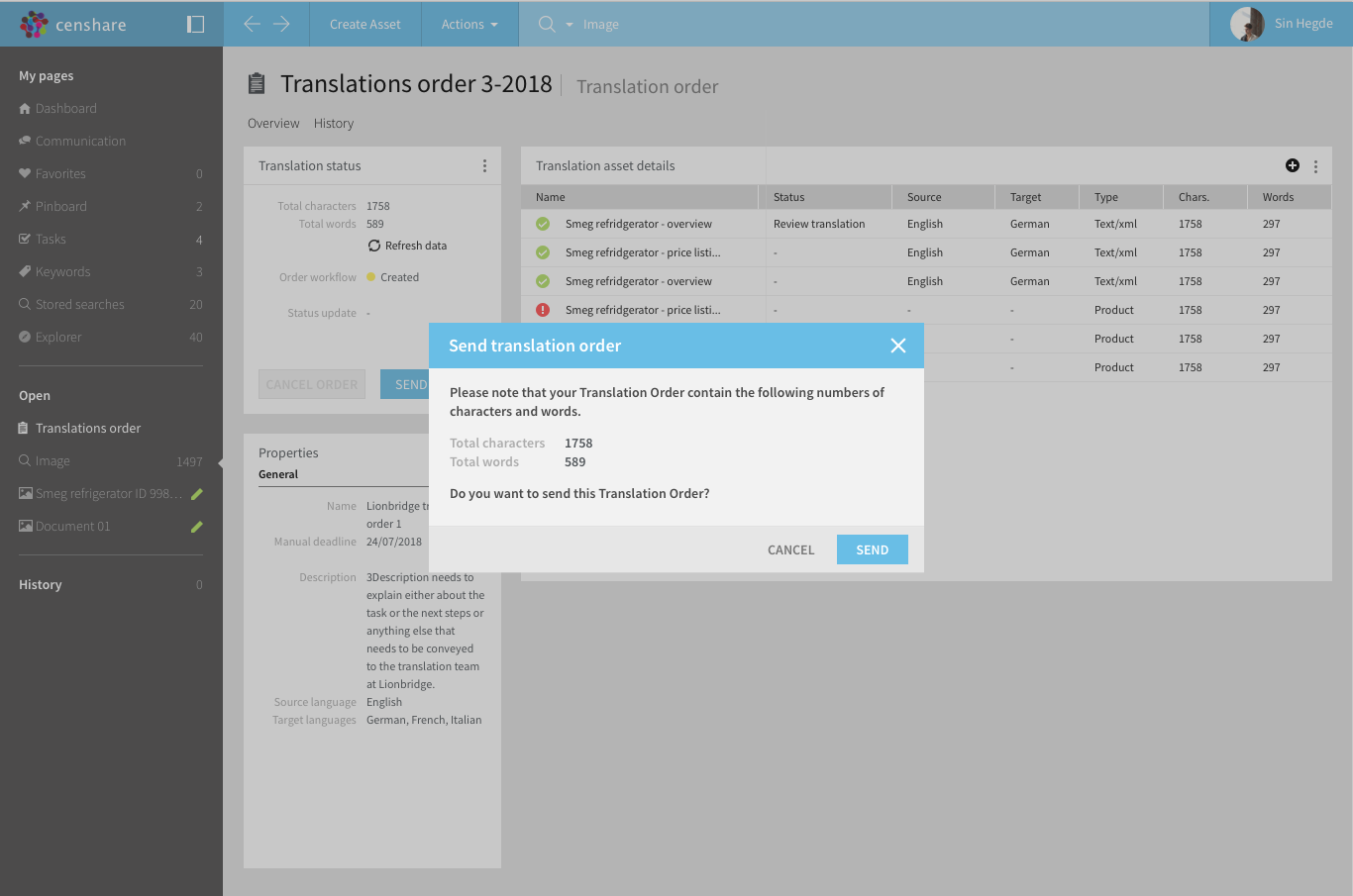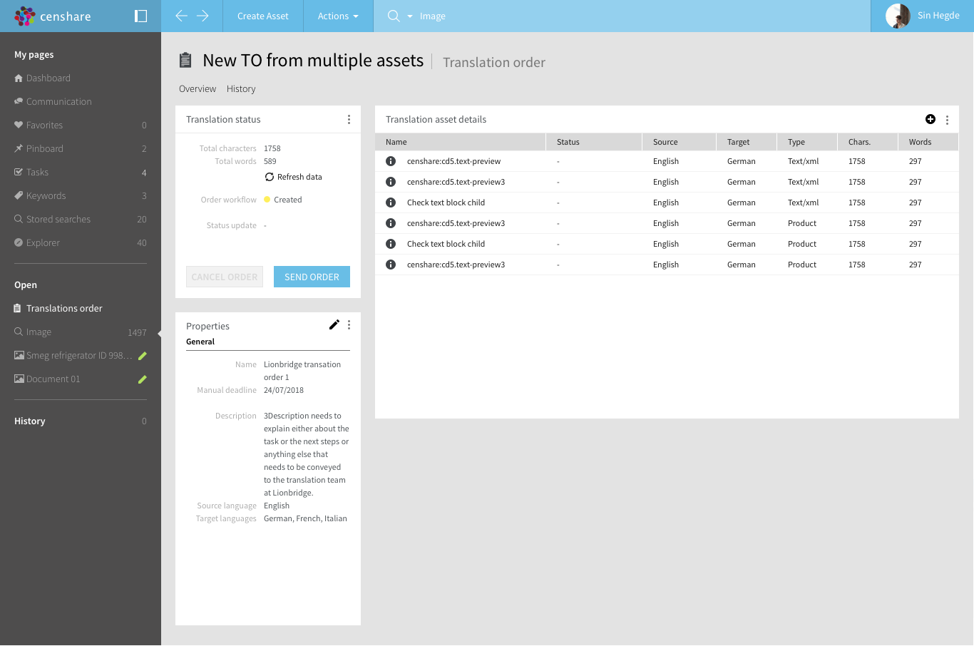 • Enables the user control and freedom change the translation order assets before it is sent.
